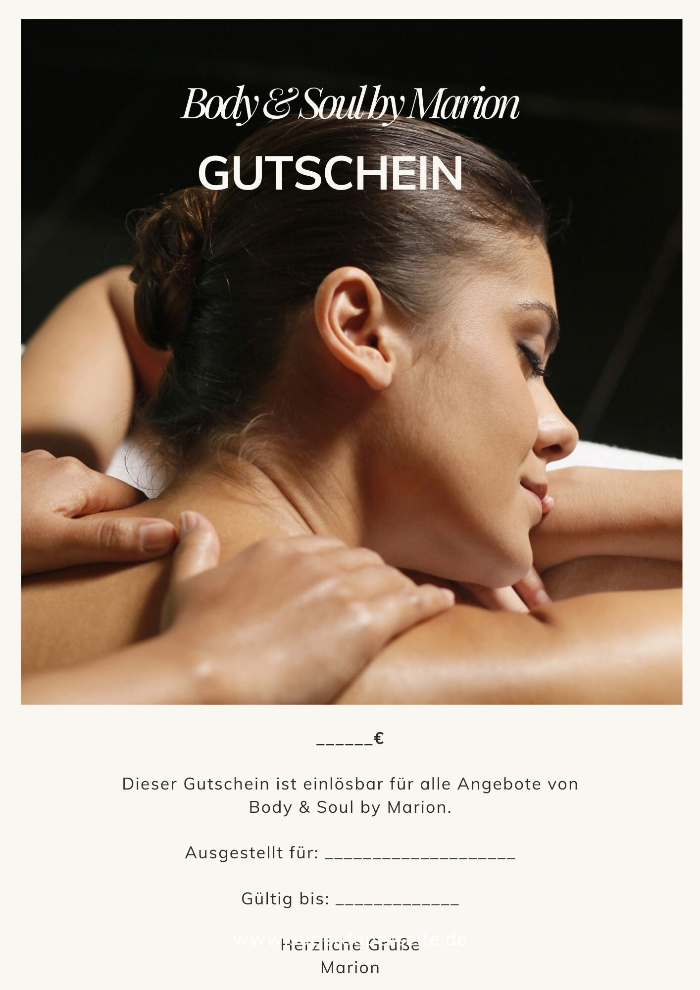 Dieser Wertgutschein ist frei einlösbar für alle Massagen, Coachings und Angebote von Body & Soul by Marion.